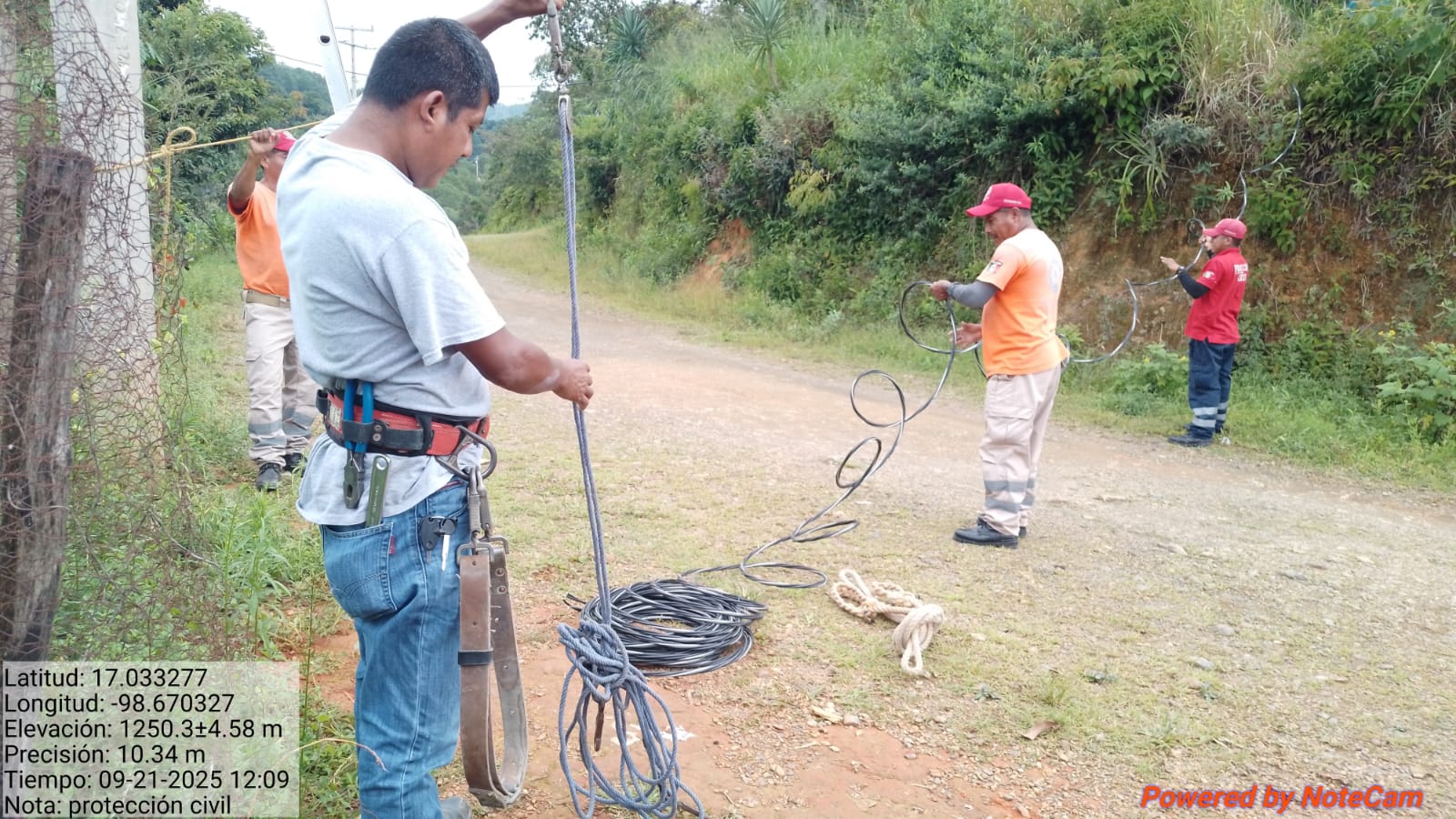 La dirección de protección civil en coordinación con la dirección de alumbrado publico, por instrucciones del presidente municipal Gerardo olivera Raymundo atiende el reporte de los ciudadanos de san juan del rio, para la reconexión del cable de baja tención que sufrió afectaciones por las fuertes tormentas que ocurrió en días pasado.